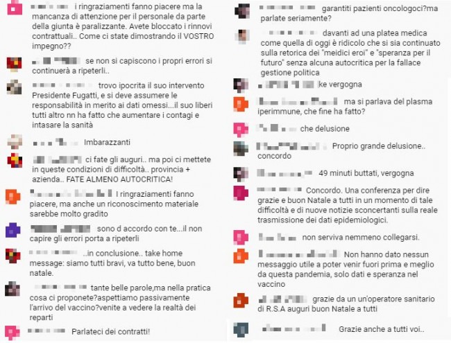 Un altro utente accusa: “Trovo ipocrita il suo intervento Presidente Fugatti, e si deve assumere le responsabilità in merito ai dati omessi. Il suo liberi tutti altro non ha fatto che aumentare i contagi e intasare la sanità”. Di commenti positivi praticamente non ce ne sono: “Ma non andava tutto bene fin all’altro ieri? Come operatrice sanitaria mi sento poco rispettata. Tutto ciò è imbarazzante”. Forse però la sintesi migliore è quella fatta da un’altra utente delusa: “Una conferenza per dire grazie e buon Natale a tutti in un momento di tale difficoltà e di nuove notizie sconcertanti sulla reale trasmissione dei dati epidemiologici”.