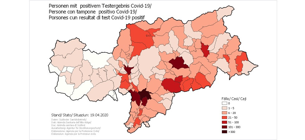 Da inizio epidemia ci sono 54 morti con Covid-19 a Bolzano, quindi 29 ad Appiano e 17 a Castelrotto. Sono 15 i decessi a Merano e 14 a Laives, 11 a Ora e 10 a Ortisei. Ci sono 9 vittime a S. Leonardo in Passiria, 7 a Selva val Gardena e Montagna, 7 a Brunico e 6 a Bressanone.