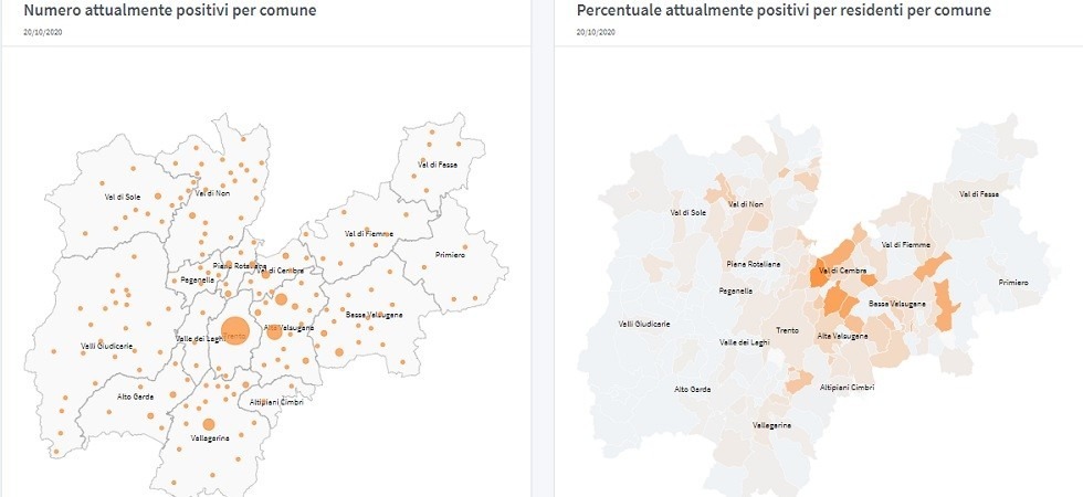Tassi di contagio. A Pellizzano è stato contagiato l'8,3% della popolazione, mentre a Pieve di Bono-Prezzo il 6,9%, segue Borgo Chiese a 6,6%. Poi Campitello di Fassa (6,2%), Bleggio Superiore (5,3%), Canazei (5,1%), Vermiglio (4,3%), Cembra Lisignago (3,8%) e Mazzin (3,4%), Ledro (3,3%), Predazzo (3,1%), Canal San Bovo (3%), Valdaone, Nomi e Storo (2,8%), Carzano (2,7%), Spiazzo, Cavedago e San Giovanni (2,6%).