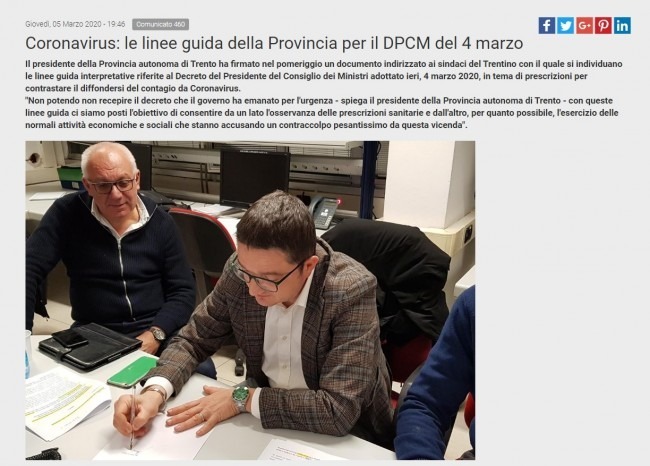 Il presidente della Provincia di Trento ha firmato, infatti, giovedì 5 marzo un documento indirizzato ai sindaci con il quale vengono individuate le linee guida interpretative riferite al Decreto di Roma in riferimento alle prescrizioni per contrastare il diffondersi del contagio da coronavirus.