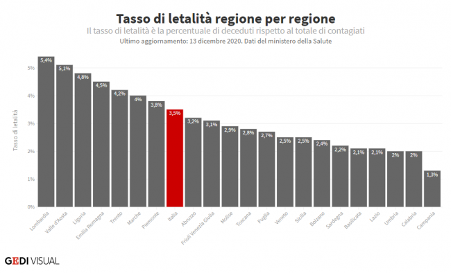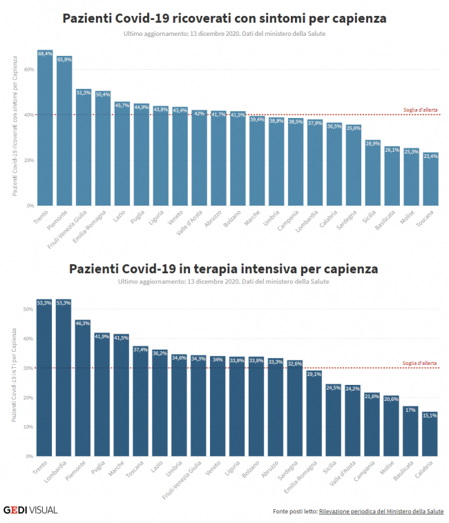 Rispetto a 4 giorni fa non sono stati registrati grandi miglioramenti: il 10 dicembre i pazienti Covid-19 ricoverati avevano raggiunto la capienza del 71,4%, mentre quelli in terapia intensiva sono rimasti stabili al 53,3%. Il problema è che le soglie critiche sono fissate rispettivamente al 40% e al 30% della capienza, per questo i dati trentini fanno preoccupare le autorità sanitarie provinciali e nazionali. In proporzione il Trentino fa peggio di Lombardia, Piemonte e Veneto alcune fra le Regioni più colpite dalla pandemia.