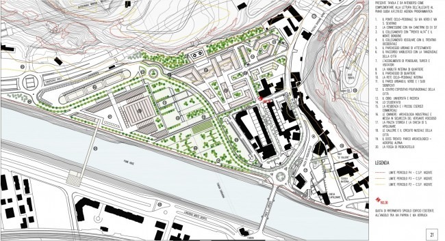 Nel piano guida è prevista la residenza, in buona esposizione, con servizi commerciali, artigianali, sociali e sanitari di quartiere. Lo studentato e le strutture universitarie per la ricerca (tipo CIBio) saranno integrate il più possibile con la struttura urbana e comunque in contiguità con la residenza. Il centro espositivo polifunzionale, con la pluralità delle attività che in esso si possono svolgere, comprenderà quelle a carattere di straordinarietà, come per esempio funzioni fieristico-espositive, mostre e concerti, è posto in riva all’Adige, di accesso immediato dal ponte ciclo pedonale, dal sistema dei parcheggi di attestamento, con integrata una piazza e inserito nel sistema complessivo del parco urbano.