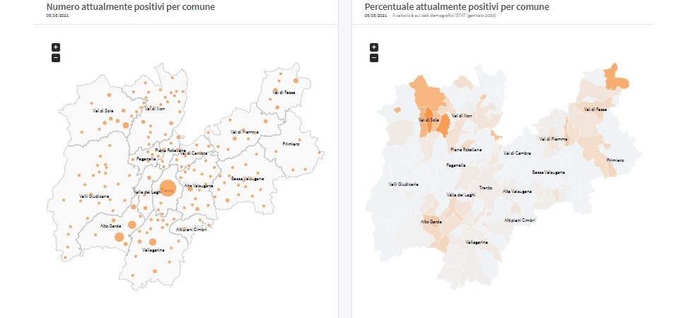 E poi 4 casi a Predazzo e Moena (+1); 3 casi a Ala (+1), Malè (+1), Cavalese, Vallelaghi, Cavedine, Borgo Valsugana, Caldonazzo, San Giovanni di Fassa, Pellizzano e Commezzadura. E 2 contagi a Calliano (+2), Villa Lagarina (+1), Lavis, Cles, Giovo, Pinzolo, Ziano di Fiemme, Aldeno, Pomarolo, Canal San Bovo, Panchià e Imer.