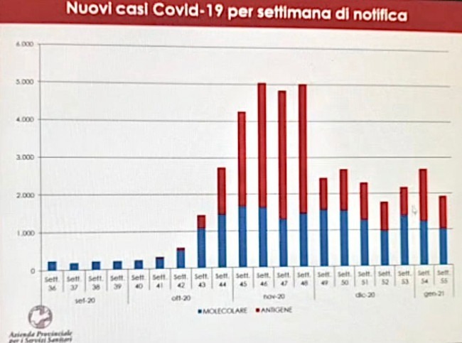 Nel mese di novembre il Trentino è stato, però, travolto dal Covid-19 ma solo un terzo dei dati è stato regolarmente comunicato alla comunità. La conferma arriva dall'Azienda provinciale per i servizi sanitari. Un fine ottobre in crescita, poi novembre: una settimana con oltre 4 mila contagi, tre settimane a 5 mila casi. In dicembre (dal 4 vengono comunicati anche i test antigenici a Iss e ministero) c'è un calo delle positività, anche se i numeri restano superiori ai 2 mila nuovi positivi a settimana.