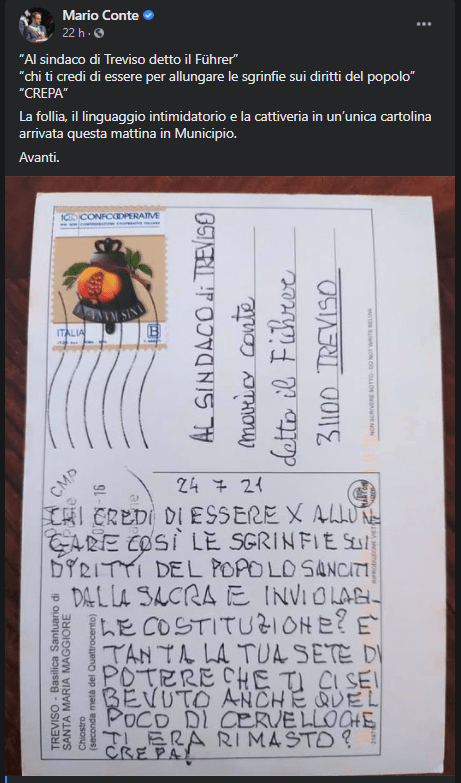 La replica del primo cittadino alle accuse ricevute è arrivata il 23 luglio e non è probabilmente un caso, visto il contenuto, che la cartolina anonima di minacce arrivata ieri (venerdì 30 luglio) in municipio sia datata il giorno successivo, 24 luglio. “Al sindaco di Treviso – si legge nella cartolina – Mario Conte detto il Führer. Chi ti credi di essere per allungare così le sgrinfie sui diritti del popolo sanciti dalla sacra e inviolabile costituzione? È tanta la tua sete di potere che ti sei bevuto anche quel poco di cervello che ti era rimasto? Crepa”. Parole pesantissime, che non hanno però intimorito il primo cittadino, che ha condiviso una foto della cartolina commentando: “La follia, il linguaggio intimidatorio e la cattiveria in un'unica cartolina arrivata questa mattina in municipio. Avanti”.
