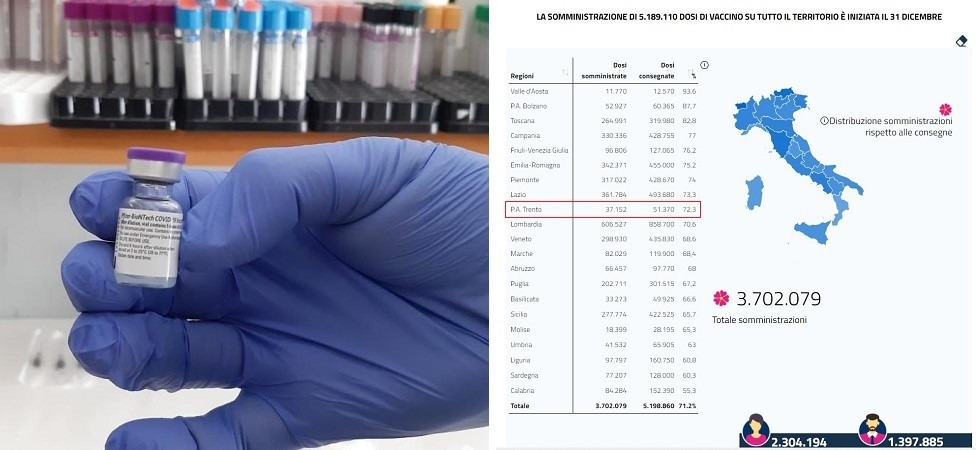 Secondo alcune stime, procedendo con questo ritmo, il Trentino completerà la campagna vaccinale dopo l’estate del 2023. Il ricercatore dell’Istituto Nazionale di Fisica Nucleare di Padova: “L’impressione è che alcuni territori abbiano già raggiunto il limite giornaliero di dosi che riescono a somministrare”. Intanto dai portali nazionali le somministrazioni di AstraZeneca sarebbero ferme, in Trentino, ma non è così: ecco perché