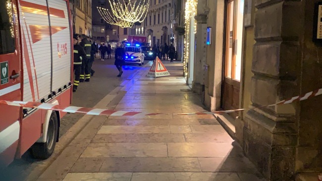 I vigili del fuoco e gli agenti della polizia locale sono attivi in centro storico a Trento per un paio di lastre di ghiaccio pericolanti su una via in centro storico