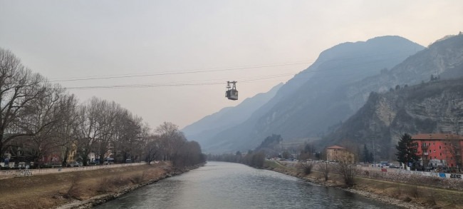 Un'attività che incuriosisce diversi cittadini che osservano l'intervento dei soccorritori per evacuare una cabina sospesa sul fiume Adige.