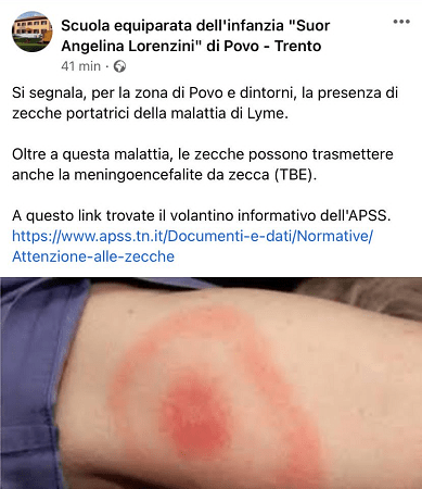 Un'invasione, tanto che la Scuola equiparata dell'infanzia "Suor Angelina Lorenzini" di Povo ha segnalato sui social di prestare attenzione per la "presenza di zecche portatrici della malattia di Lyme. Oltre a questa malattia, possono trasmettere anche la Tbe".