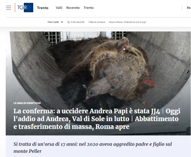 TRENTO. E' l'orsa JJ4 ad aver aggredito e ucciso Andrea Papi. Da parte della Provincia nelle prime ore di questa mattina era stato confermato che non vi erano notizie ufficiali. La conferma, però, come riportato dalla Rai, è arrivata dalla Procura. La notizia era stata riportata anche dal T Quotidiano.