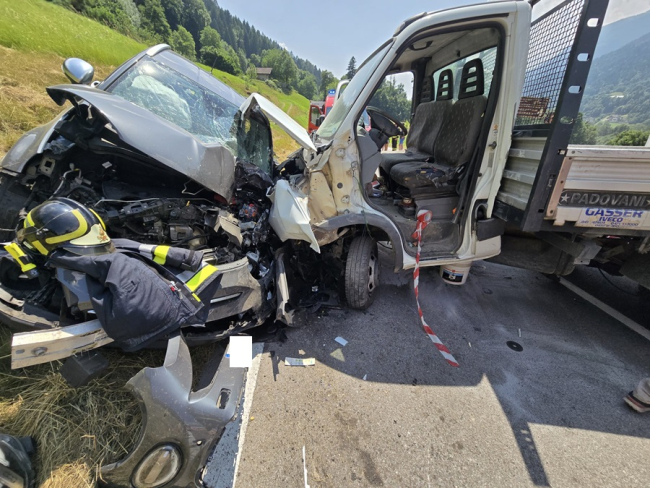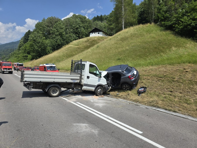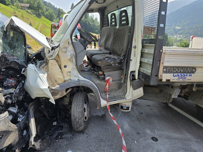 GIUSTINO. Spaventoso incidente in val Rendena, violento scontro tra un furgone e un'auto con quest'ultima spinta all'esterno della carreggiata. Necessario l'uso delle pinze idrauliche. Tre le persone portate all'ospedale.