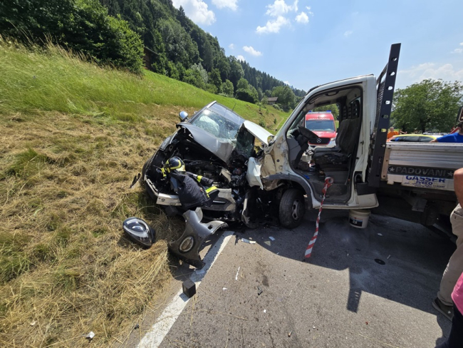 Spaventoso frontale tra un furgone e un'auto (FOTO), macchina spinta fuori dalla strada e occupanti bloccati tra le lamiere. Tre feriti portati in ospedale