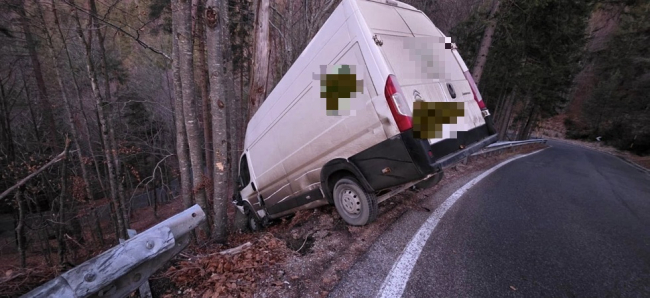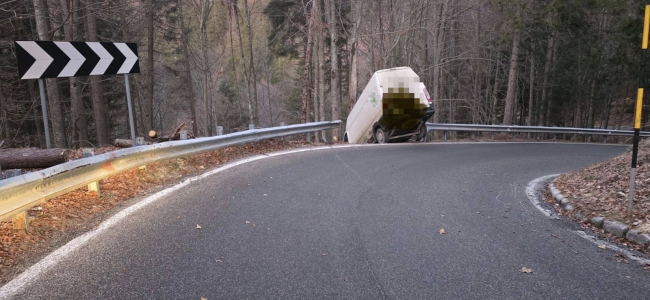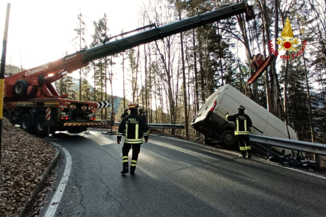 AURONZO DI CADORE. Si è schiantato contro il guardrail, divelto nell'impatto, e alcuni alberi. Il mezzo è così rimasto in bilico sulla scarpata. Momenti di paura nel Bellunese e lunghe operazioni dei soccorritori per recuperare il furgone.