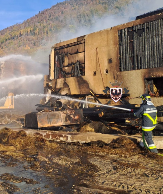 Proseguono senza sosta le operazioni di spegnimento del rogo che nella giornata di ieri, 6 novembre, ha colpito un deposito per lo stoccaggio del fieno a Masi di Telve