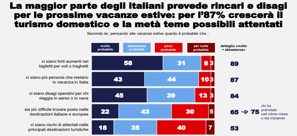 Dati che confermano il quadro dipinto in precedenza: “Gli italiani – continuano da Radar Swg – prevedono infatti un'estate segnata da rincari e disagi sul fronte dei voli e delle prenotazioni, con un certo timore di attentati nelle principali mete turistiche”. In particolare, l'87% degli intervistati si è detto convinto che il turismo domestico crescerà, l'89% ritiene probabile forti aumenti per i biglietti di voli e traghetti e il 53% che ci siano rischi di attentati nelle principali destinazioni turistiche.