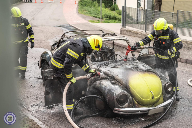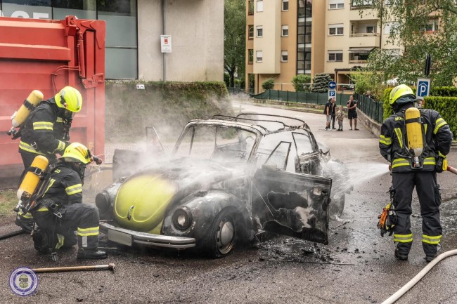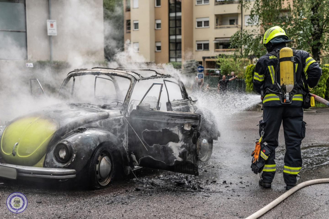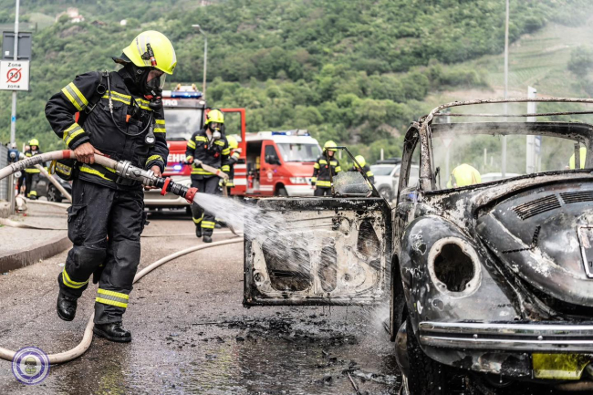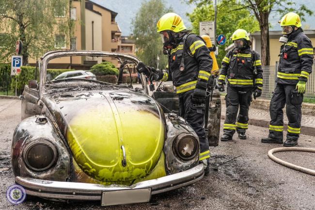 MERANO. Un Maggiolino è stato avvolto dalle fiamme. L'auto d'epoca è andata distrutta nonostante il veloce arrivo dei vigili del fuoco.