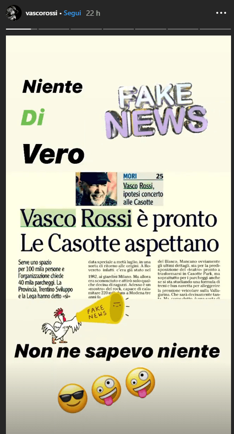 Eppure sui canali social del Vasco ecco che è apparsa quella che a tutti gli effetti sembra una clamorosa smentita: ''Niente di vero, fake news, non ne sapevo niente'' con tanto di gallo che strilla ed emoticon a colorare la story sia su Instagram che su Facebook.