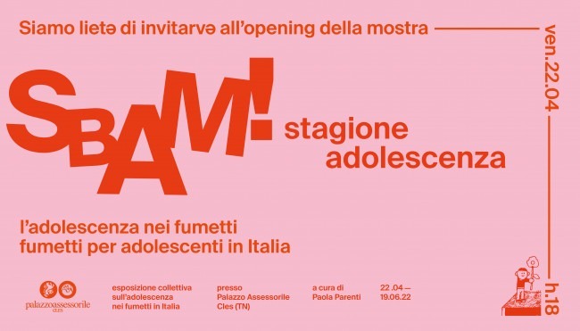 "L’adolescenza nei fumetti, fumetti per adolescenti in Italia" si terrà a Palazzo Assessorile a Cles, dal martedì alla domenica dalle 10 alle 12 e dalle 15 alle 18 (apertura straordinaria lunedì 25 aprile. Oltre alla mostra anche laboratori, talk, musica. La didattica e le visite guidate saranno a cura di Batibōi Gallery e La Coccinella. La grafica: Angelica Stimpfl. Artwork: Edoardo Massa.