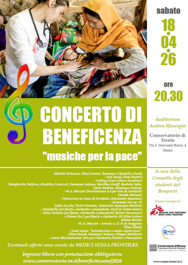 L’iniziativa nasce dalla volontà e dall’impegno della Consulta degli Studenti del Conservatorio, che ha promosso e organizzato l’evento con l’obiettivo di unire la forza della musica a un gesto concreto di solidarietà: raccogliere fondi a favore di Medici Senza Frontiere, organizzazione da anni in prima linea negli interventi umanitari nelle aree più fragili del mondo.