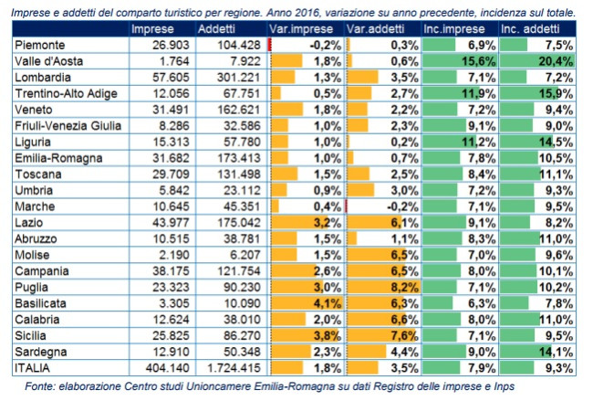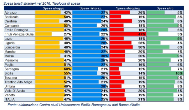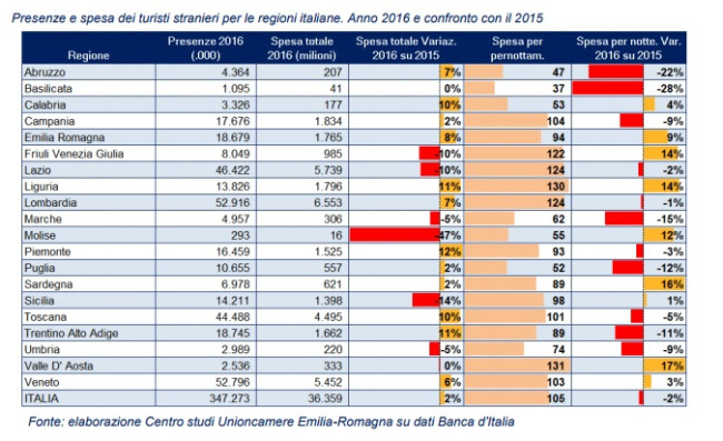Il numero delle presenze straniere in Italia nel corso del 2016 è aumentato del 3,8%, la spesa turistica generata dagli stranieri in Italia è cresciuta del 2,3%. Lombardia, Lazio, Veneto e Toscana le aree dove si concentra maggiormente la spesa degli stranieri, complessivamente le quattro regioni raccolgono oltre il 60% del fatturato del turismo internazionale in Italia.