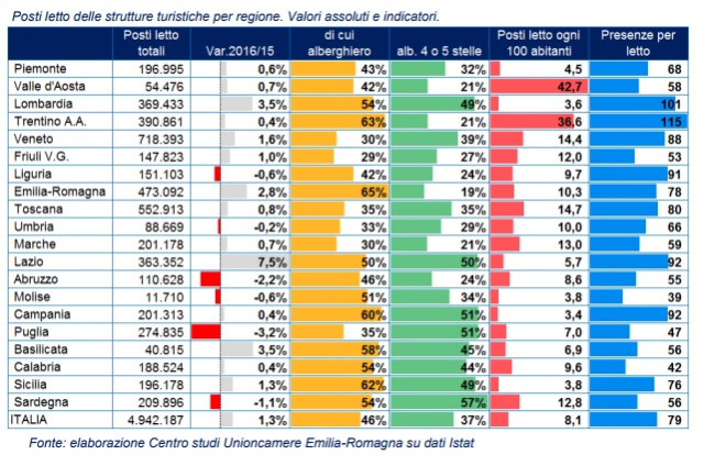 Nel 2015, ultimo aggiornamento Istat disponibile, le presenze turistiche hanno sfiorato i 400 milioni: il 16% in Veneto, quindi Trentino Alto Adige, Toscana, Lombardia e Emilia-Romagna.