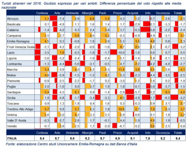 I dati Banca d’Italia offrono anche una valutazione qualitativa dell’esperienza fatta dal turista straniero in Italia, complessivamente il voto è buono, 8,4. I valori più alti riguardano l’arte e la cucina, entrambi con 8,7 in pagella, i giudizi meno positivi riguardano i prezzi (6,9) e le informazioni e i servizi per i turisti (7,8). Per 'cortesia' si distingue in positivo il Trentino Alto Adige.