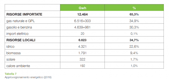 Come riportato nel “Piano energetico ambientale provinciale 2021-2030” la fornitura delle fonti energetiche primarie e secondarie nel 2016 (l’ultimo dato disponibile) è stata di 19.087 gigawattora. Questo dato in sostanza rappresenta quanta energia è stata consumata in Trentino in un anno. Le risorse importate sono pari al 65,3% del totale: si tratta di gas (gas naturale e Gpl) al 34,9%, seguito dai prodotti petroliferi (gasolio e benzina) al 30,3% e dall’import elettrico da rete nazionale che pesa solo lo 0,1%. Grazie alle sue risorse (provenienti da fonti rinnovabili) il Trentino copre il 34,7% del fabbisogno energetico totale. Tra queste spiccano la risorsa idrica (22,6%) e le biomasse (9,4%), decisamente inferiore l’utilizzo di energia solare (1,7%) e calore ambiente (1,0%).