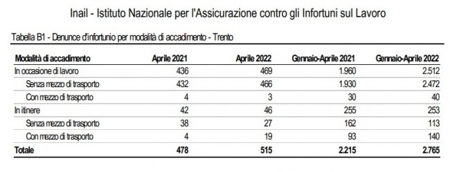 I dati sono stati diffusi dall'Inail, a livello nazionale nel primo quadrimestre del 2022 si registra, rispetto all’analogo periodo del 2021, un deciso aumento delle denunce di infortunio un calo di quelle mortali e una crescita delle malattie professionali. Per quanto riguarda i casi mortali, a livello locale, la Provincia di Trento viene indicata come territorio con il maggiore aumento