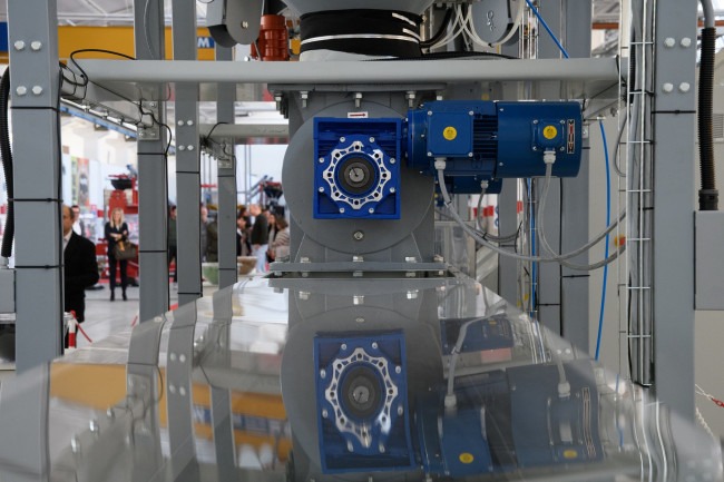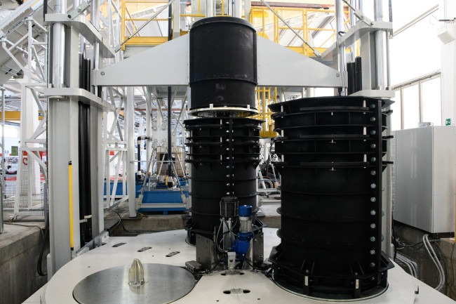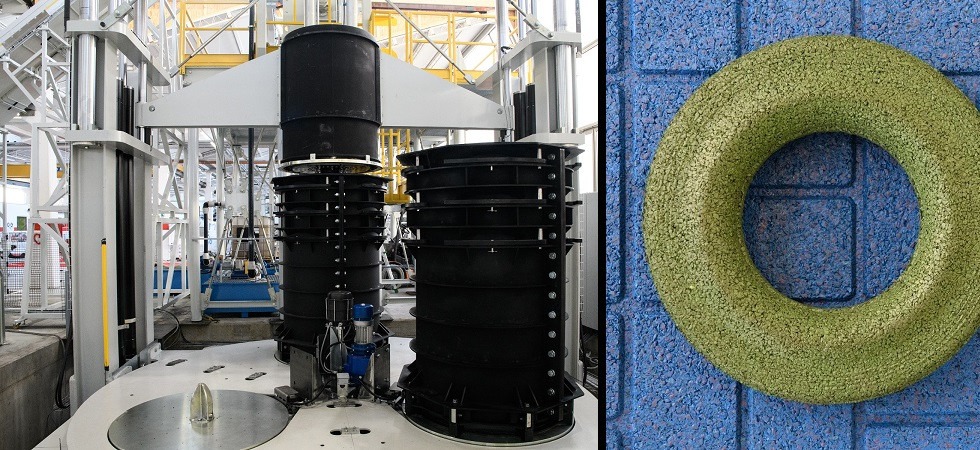 La struttura si compone di un mescolatore con speciali vomeri e una capacità di 3.300 litri, inoltre vanta uno speciale nastro collegato a una gigantesca pressa oleodinamica installata in una buca profonda più di un metro e dotata di un tavolo rotante per processare in continuo il materiale su più stampi. Tale “giostra” ha una capacità produttiva tripla rispetto allo standard, perché permette di processare fino a tre stampi all’ora, contro l’uno processato negli impianti standard.