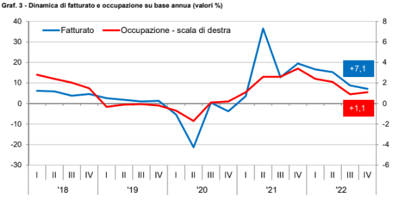 A confermare poi il quadro in decelerazione sono anche gli altri indicatori rilevati: “L'occupazione continua a espandersi ma su valori decisamente più modesti rispetto ai primi sei mesi, le ore lavorate denotano una sostanziale stagnazione e gli ordinativi, pur rimanendo positivi, sperimentano una crescita più che dimezzata in confronto con i periodi precedenti”. A causa degli elevati livelli d'inflazione in ogni caso è difficile in questa fase definire con puntualità lo stato della situazione economica delle imprese esaminate partendo dai dati economici rilevati: “Tuttavia – ribadiscono gli esperti – si può ritenere che in questo ultimo trimestre dell'anno la produzione in termini reali, al netto quindi dell'aumento dei prezzi, abbia sperimentato una moderata contrazione”.