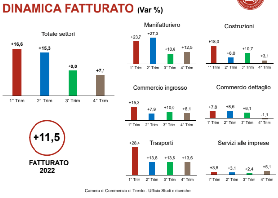 TRENTO. Il quadro economico trentino è in decelerazione: è questo in sintesi quanto emerge dai dati relativi al quarto trimestre del 2022 elaborati dall'Ufficio studi e ricerche della Camera di commercio, industria, artigianato e agricoltura del Trentino. Nell'analisi congiunturale degli esperti, si evidenzia dunque un “sensibile rallentamento rispetto ai primi sei mesi del 2022” e mentre le variazioni tendenziali del fatturato “sono ancora positive nella quasi totalità dei settori economici e classi dimensionali”, a livello complessivo “la crescita è dimezzata in confronto con la prima parte dell'anno e in ulteriore lieve decelerazione rispetto al trimestre precedente”.