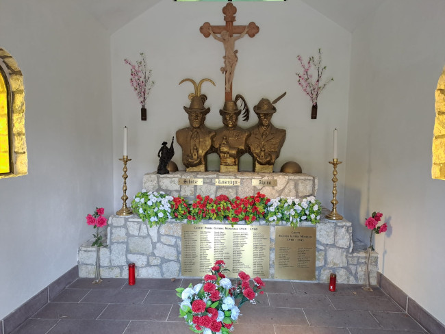 Come il conflitto abbia profondamente segnato questo territorio lo vediamo sin dai primi passi di questo itinerario. Partiti da un parcheggio posto pochi metri prima di Passo Coe (all’altezza del bivio che porta al rifugio Camini), il percorso comincia con la visita di una chiesetta di recente costruzione caratterizzata dal ricordo dei caduti delle guerre che dal Settecento arrivano fino ad oggi. Sorta nel “palcoscenico” di aspri scontri avvenuti fra il maggio del ’15 e il maggio del ’16, questa struttura ospita tre busti in legno, opera di artisti gardenesi, rappresentanti gli Schützen caduti fra il ‘700 e il 1914, i Kaiserjäger caduti fra il ’14 e il ’18 e infine i soldati in divisa italiana caduti tra il 1940 e il 1945.