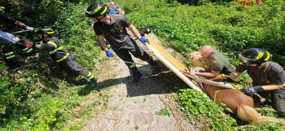 Il padrone non era in grado di farlo risalire in autonomia e così è stato necessario l'intervento dei vigili del fuoco che tra assi di legno, imbracature e corde sono riusciti ad issare il cavallino e a riportarlo sano e salvo sul sentiero. Recuperato ed affidato alle cure del proprietario l'animale ha potuto riprendere la sua marcia senza conseguenze.
