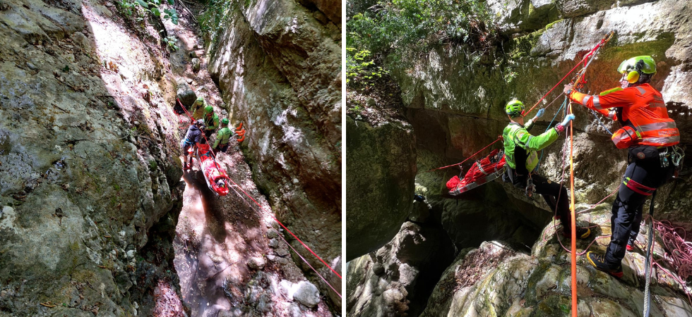 Complesso intervento del soccorso alpino per aiutare una 45enne rimasta infortunata al bacino mentre faceva canyoning con una comitiva: per farle superare in barella l'ultima cascata i soccorritori hanno attrezzato una teleferica