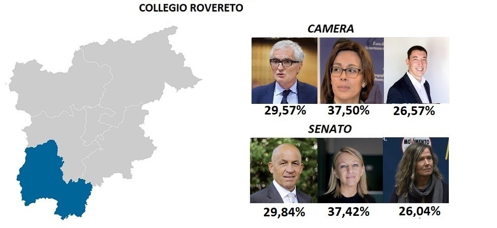 Al Senato prevale Donatella Conzatti con 29.327 preferenze e il 38,35%. Tiziano Mellarini chiude al 29,84% e 22.822 voti, quindi Cinzia Boniatti al 26,03% (25.213). Annalisa Foletti al 2,88%. Alessia Conforto, Doranna Meneghelli e Emiliano Fumaneri, rispettivamente all'1,22%, 1,10% e 1%.