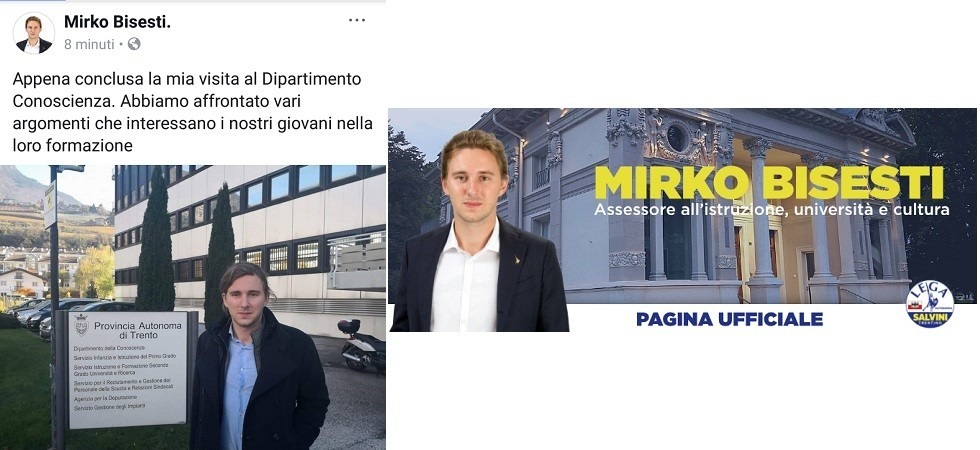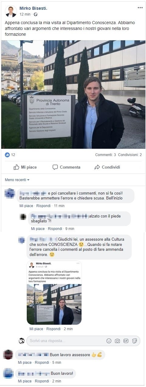 TRENTO. Si parte subito col botto. Il neo assessore all'Istruzione, Cultura e Università Mirko Bisesti inaugura il suo percorso alla guida del mondo della cultura provinciale con un errore da terza elementare: "Appena conclusa la mia visita al Dipartimento Conoscienza. Abbiamo affrontato vari argomenti che interessano i nostri giovani nella loro formazione". Dunque la conoscenza diventa conoscienza e sono subito risate. Il suo post di questa mattina infatti conteneva un errore di quelli da rigone rosso e insufficienza immediata a scuola.