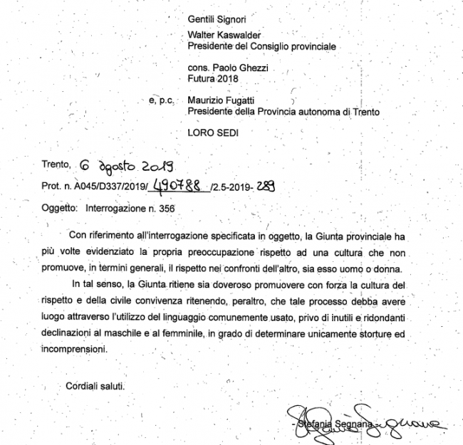''A fronte di tutto ciò - chiedeva Ghezzi - vorremmo sapere se condivida le diffuse preoccupazioni per una cultura maschilista che continua a “passare” attraverso la lingua che usiamo, e se intenda rimuovere il linguaggio sessista dalla comunicazione ufficiale della Provincia autonoma di Trento''. Segnana ha risposto con queste poche frasi che pubblichiamo qui sotto integralmente. Questo invece il commento della senatrice di Forza Italia Donatella Conzatti: ''Con il linguaggio non solo comunichiamo ma disegniamo per noi stessi e per gli altri una rappresentazione del mondo. Un linguaggio sprezzante oppure un linguaggio che non tenga conto del femminile, rappresentano un mondo privo di rispetto ed escludente. Un esempio: se ad una platea un relatore si rivolgesse dicendo “benvenute”, suonerebbe escludente a tutti gli uomini presenti. Bene: alle donne anche sembra strano non essere presenti nel linguaggio corrente. Il Senato della Repubblica si è adeguato, dalla carta intestata ai dialoghi in aula veniamo nominate e chiamate senatrici. E’ la direzione giusta l'unica che si può seguire. Lo dice anche la Crusca''.