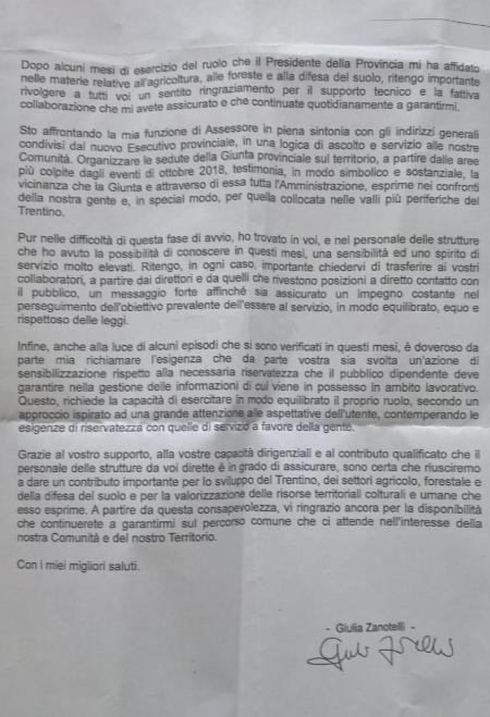 TRENTO. ''E' doveroso da parte mia richiamare l'esigenza che da parte vostra sia svolta un'azione di sensibilizzazione rispetto alla necessaria riservatezza che il pubblico dipendente deve garantire nella gestione delle informazioni di cui viene in possesso in ambito lavorativo''. Questo un passaggio della lettera mandata il 18 aprile dall'assessora Zanotelli ai dirigenti dei diversi comparti (in fondo il documento) che rispondono all'assessorato all'Agricoltura, foreste, caccia e pesca da lei presieduto. Una richiesta definita ''ridondante'' dall'ex assessore Michele Dallapiccola (''è come ribadire che debbano timbrare il cartellino, se rientra nei loro compiti lavorativi che senso ha un tale richiamo?'', commenta) che suona, proprio per questo, come una sorta di ammonimento, di richiamo al silenzio, della serie ''nessuno si permetta di far trapelare notizie''.