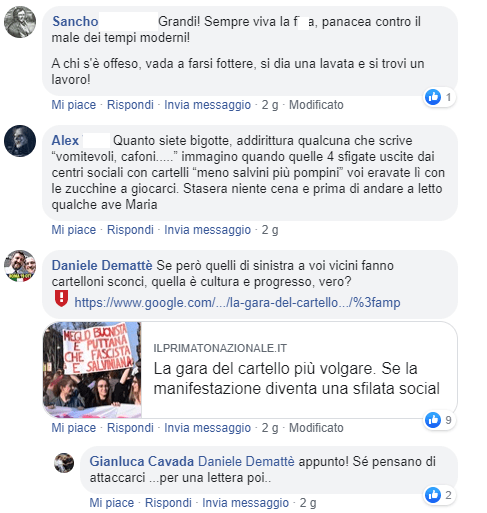 Poi tra troll e beceri commentatori (Sancho e Alex evidentemente sono entrambi) sono arrivati quelli che non hanno capito cosa è successo e hanno cercato di replicare con qualcosa che non c'entra nulla. Daniele Demattè, per esempio, storico attivista della Lega e marito della consigliera provinciale Katia Rossato ha citato ''quelli di sinistra a voi vicini'' con il consigliere provinciale Cavada (sì quello delle foto) che gli ha dato ragione con un ''Appunto''.