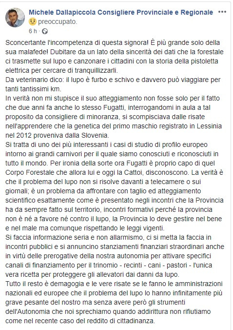 Arriva a breve giro, affidata a Facebook, la reazione di Michele Dallapiccola. "Sconcertante - scrive sui social - l'incompetenza di questa signora. È più grande solo della sua malafede. Dubitare da un lato della sincerità dei dati che la forestale ci trasmette sul lupo e canzonare i cittadini con la storia della pistoletta elettrica per cercare di tranquillizzarli. Da veterinario dico: il lupo è furbo e schivo e davvero può viaggiare per tanti tantissimi chilometri".