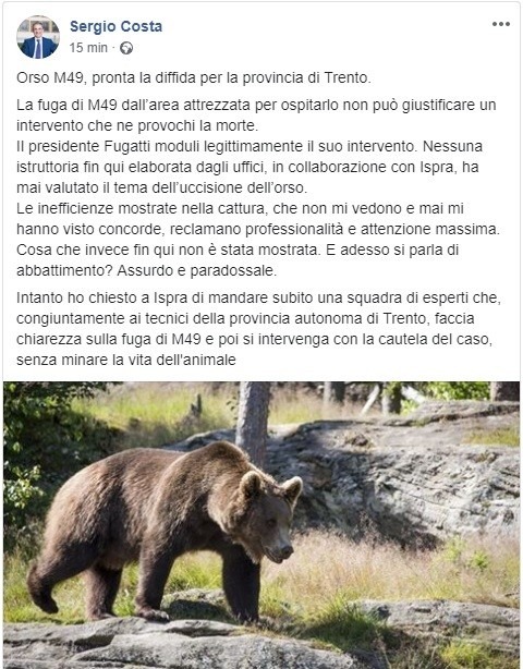 TRENTO. "E' pronta la diffida per la provincia di Trento", questo il commento del ministro Sergio Costa, che aggiunge: "La fuga di M49 dall’area attrezzata per ospitarlo non può giustificare un intervento che ne provochi la morte" (Qui articolo, qui articolo e qui articolo).