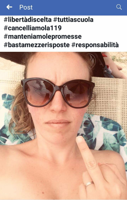In quell'occasione, contro la ministra, si era ritratta sempre su Facebook con il dito medio alzato, dicendo "#libertàdiscelta" e finendo con lo slogan tanto caro a Grillo, quello del "vaffanculo".