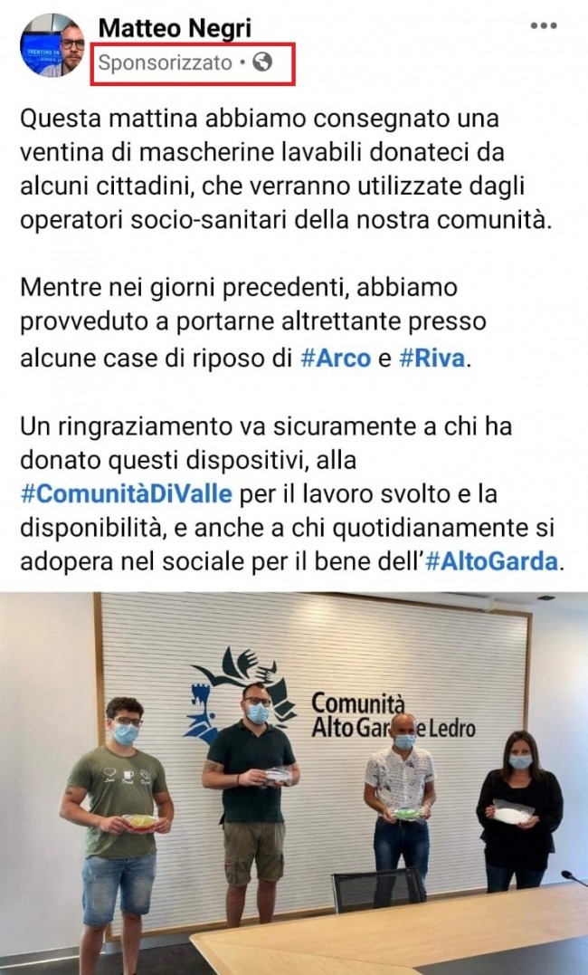 In particolare al momento della foto era presente il referente locale dei fascisti del terzo millennio, Matteo Negri, in posa al fianco di Pedergnana, che a suo tempo era finito nell’occhio del ciclone per delle foto che lo ritraevano mentre baciava una foto del duce e si esibiva in un saluto romano (QUI articolo). Ad ogni modo, il vicepresidente della comunità di Valle ha precisato: “Ci hanno chiesto se la Comunità avesse necessità di mascherine da destinare alle Rsa. Abbiamo accolto volentieri questo piccolo gesto positivo da parte di ragazzi che si sono messi semplicemente a disposizione. Non c’è bisogno di fare polemiche in questo momento”. Eppure, il gesto dei militanti di estrema destra forse non è del tutto disinteressato visto che nei giorni scorsi hanno diffuso un comunicato stampa dal titolo piuttosto eloquente: “Casapound dona mascherine sanitarie alla Comunità di Valle”. Non pago della visibilità ottenuta su alcuni quotidiani locali Negri si è preoccupato anche di sponsorizzare, con un post a pagamento su Facebook, il gesto “disinteressato”, provocando la reazione dei gruppi politici di maggioranza (la stessa di Pedergnana, benché sia fuoriuscito da tempo dal Patt).