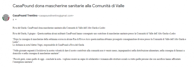 Il casus belli è stata la consegna effettuata da “privati cittadini” per un totale di 20 mascherine lavabili, donate alla Comunità di valle dell’Alto Garda e Ledro che a sua volta le girerà a una delle Rsa locali. Fin qui niente di strano, sono stati numerosi i gesti disinteressati di centinaia di cittadini che si sono attivati durante l’emergenza covid-19. Ad esempio le associazioni culturali dell’Alto Garda hanno raccolto oltre 1000 euro da destinare alle persone in difficoltà (QUI articolo). A far discutere è stata l’opportunità di un incontro istituzionale con tanto di foto con i due benefattori, volti noti dell’estrema destra locale, militanti di Casapound.