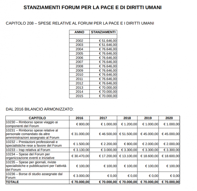 Secondo il consigliere nelle attività svolte dal Forum per la Pace non si riscontrano mansioni tali da dover essere ricercate all’esterno dell’ente provinciale: “Va notato – prosegue – come lo stesso, nel corso degli anni, abbia dimostrato un’evoluzione della sua funzione che rischia di apparire come una sorta di centro di collocamento”.