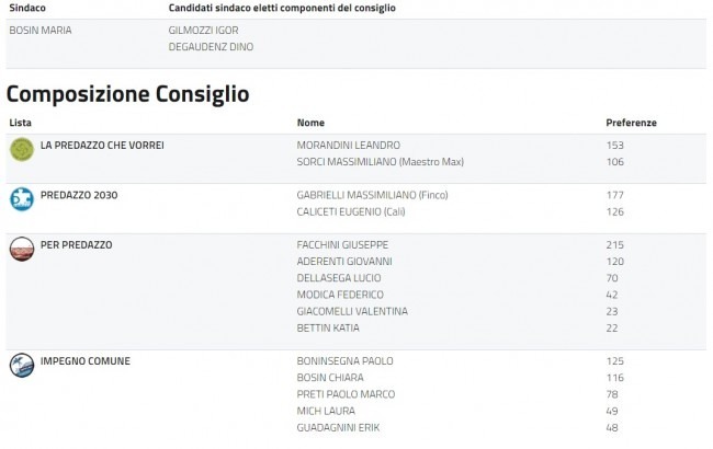 “Pedrazzo 2030” vede eletti Massimiliano Gabrielli e Eugenio Caliceti mentre “Per Predazzo” porta in Comune Giuseppe Facchini, Giovanni Aderenti, Lucio Dallasega, Federico Modica, Valentina Giacomelli e Katia Bettin. La lista “Impegno Comune” porta Paolo Boninsegna, Chiara Bosin, Paolo Marco Preti, Laura Mich e Erik Guadagnini.