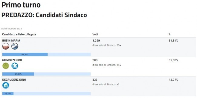 La sindaca riconfermata è stata Maria Bosin con il 51,34% di voti sostenuta da due liste “Per Predazzo” e “Impegno Comune”.