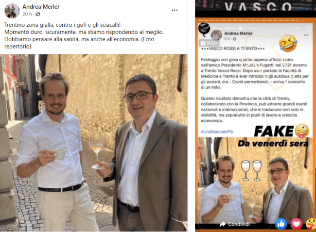 Curioso che la foto riciclata da Andrea Merler, con ''brindisi'' tra lui e Fugatti, per questo brillante post è la stessa che aveva usato per festeggiare l'ormai imminente (a detta della maggioranza leghista) arrivo di Vasco Rossi in Trentino per un concertone annunciato direttamente dal presidente Fugatti nel tentativo disperato di raccimolare qualche voto a ridosso delle elezioni comunali. L'esito se lo ricordano tutti: il Blasco che sbeffeggia il povero candidato sindaco rilanciando proprio questa immagini con tanto di scritta ''Fake del venerdì sera'' e Lega respinta praticamente ovunque nei diversi comuni trentini. Oggi la stessa immagine serve a Merler a farsi beffe dei ''rosiconi'' che dovrebbero essere quelli che da tempo chiedono più attenzione, responsabilità e trasparenza: ''Trentino zona gialla, contro i gufi e gli sciacalli! Momento duro, sicuramente, ma stiamo rispondendo al meglio. Dobbiamo pensare alla sanità, ma anche all’economia. (Foto repertorio)'' (e che repertorio, aggiungiamo noi).