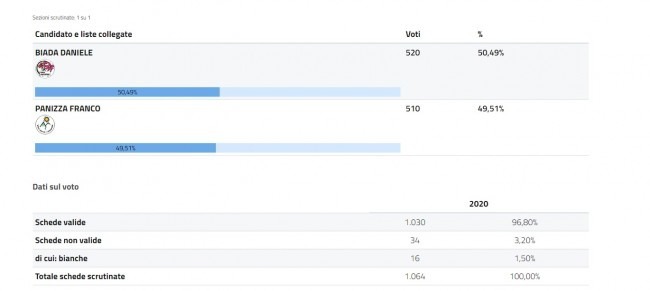 A diventare sindaco, invece, Daniele Biada che è stato votato con il 50,49% dei voti (520).