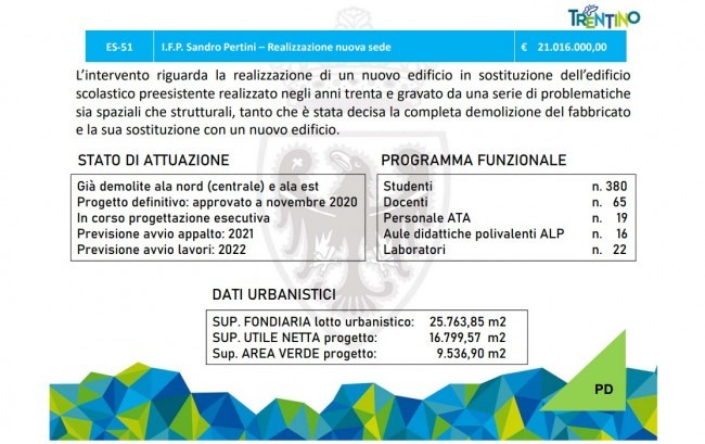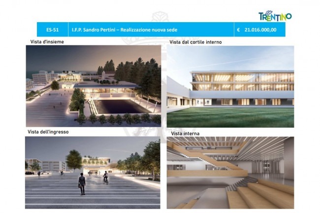 L'annuncio è arrivato dal presidente Maurizio Fugatti nel corso della conferenza stampa post Giunta. La Pat intende realizzare la nuova sede dell'Istituto Pertini in sostituzione a quella esistente; il liceo artistico Vittoria si trasferisce in via Giusti